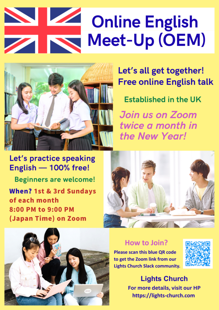 All events are free and held via Zoom. Access links are available through the Lights Church official Slack group. Smartphones, tablets, and computers are all supported. To join our Slack group, scan the blue QR code on the OEM flyer or click here. Also, you can join us by filling in the participaiton form.